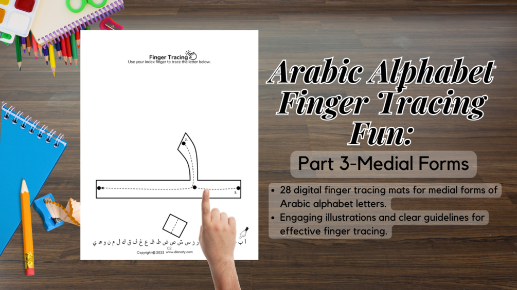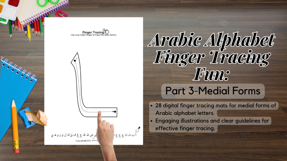 One PDF File containing 28 digital finger tracing mats for medial forms of Arabic alphabet letters. Engaging illustrations and clear guidelines for effective finger tracing.